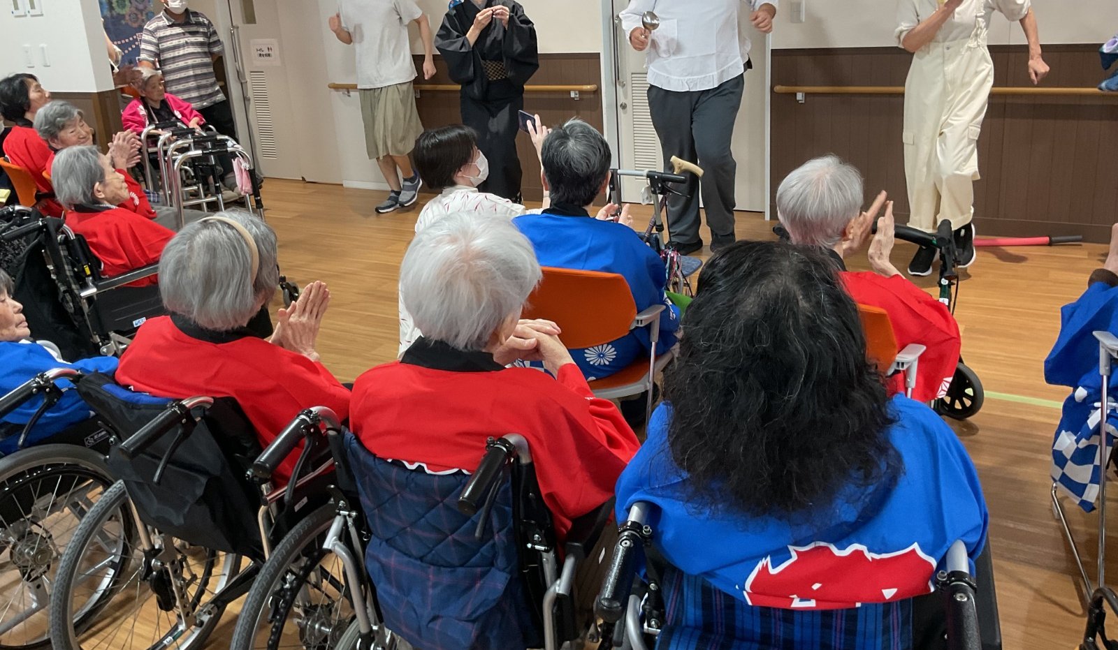 各ユニットから出し物をして楽しみました🌻Aユニットはみんなで歌を歌いました♪Bユニットはテーブルクロス引きと二人羽織をしました👘Cユニットはサザエさん体操と抽選会を行いました☆